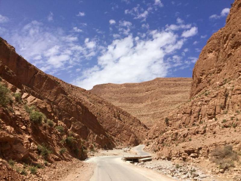 Hoy hemos disfrutado de una ruta de incalculable belleza natural, las dos grandes gargantas olvidadas de Gheris e Imiter. Un espectáculo sobrecogedor que nos ha provocado una introspección personal en un mundo de emociones visuales tremendas. Partimos desde Alnif hasta Tinerhir, llegamos a las gargantas del Todra donde contemplamos con tristeza un atasco monumental y agobiante de autobuses, todoterrenos y un sin fin de turistas ocupando cada centímetro del río y la calzada... un par de fotos y huimos como alma que lleva el diablo en dirección a la aldea beréber de Tamtatoucht, un remanso de paz rodeado de verdes campos de cultivo y almendros en flor. El río Gheris que bendice con sus aguas, junto con el río Ziz, la región del Tafilalet, ha excavado dos profundas gargantas hasta morir en el sur: la garganta del Gheris y la garganta de Imiter. El río fluye ralo entre inmensos cañones de paredes verticales de caliza rojiza cuya altura supera los doscientos metros y que hemos podido contemplar en solitario. Es una zona poco transitada, lo que nos ha permitido disfrutar de cada curva, de cada recoveco, rodando entre una amalgama de paisajes conformados por roquedos desnudos, palmerales intensos entre campos de cultivos cuyo frescor nos llegaba a pie de carretera, estepas desérticas de tonos miel y unos pequeños pueblos incrustados en las paredes verticales del cañón, desafiando las leyes de la gravedad. La anchura de la garganta puede superar los ochenta metros y refleja la acción erosiva del agua durante sus temibles crecidas, sobre todo, en las curvas amplias y afiladas que el río ha esculpido en la roca prieta durante miles de años. A lo largo del cauce embaucador, que tuvimos que cruzar hasta en cuatro ocasiones, nos topamos con enormes bloques de piedra arrastrados como cañas por la fuerza bravía del Gheris. El Valle se abre a la luz en Amellago pero a pocos kilómetros avistamos de nuevo, otros enormes farallones rocosos que nos aprietan en la siguiente garganta, la de Imiter. Me llama la atención sus aldeas encaramadas como nidos de buitres en el ausente espacio posible que las murallas rocosas les permiten, aprovechando los resquicios naturales de la piedra abierta. Seguimos rodando con ansia y poco antes de llegar a Ait Hani vemos como en los estratos horizontales de algunas montañas se han formado Cuevas, ahora moradas en las que se han instalado familias nómadas junto a sus rebaños de cabras. Finalizamos la garganta de Imiter con una magnífica postal que se queda prendida en mi memoria cuando el río acuarela una hermosa balsa de aguas turquesas... y siempre hay un bullicio de niños que juegan, de mujeres bregando en el río o en la tierra... de ancianos que recuerdan y de jóvenes que construyen con sus manos otra tierra... nos imbuimos de nuevo en el desierto sordo repleto de máquinas gigantes que excavan y agujerean con fuerza, no sé muy bien qué, perfilando el horizonte aburrido con sus formas colosales y llegamos a Errachidia, tierra militar que atesora un mercado popular fascinante... ya empiezo a soñar con mañana...
