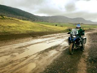 Hoy ha amanecido un día de agua sin fin, los cielos ahumados vertían océanos de agua dulce sobre nuestras cabezas y las montañas parecían esponjas henchidas que evacuaban ríos infinitos, ladera abajo, hasta buscar los rebosados aliviaderos que cubren de lodo y espejos el maltrecho asfalto... la carretera se estrechaba perdiendo arcenes y centímetros conforme nos adentramos en la belleza de unos prados tan húmedos como bellos... huele intensamente a tierra mojada, huele tanto que puedo saborear la arcilla roja que impregna las botas. La moto se desliza entre el barro resbaloso serpenteando caminos inútiles, intenta seguir la trazada una y otra vez pero la tormenta la pierde entre bancos de agua, piedras y lodo. Los campos son de un insultante verde salpicados de florecillas moradas y amarillas, huele a limpio. Empezamos a cruzar pueblitos solos y abandonados de veredas imposibles donde los niños juegan al fútbol en campos abiertos con chanclas de agua... las totovías sacuden las plumas en las pinchudas acacias o sobre los brezales gastados mientras los machos rebuscan semillas en el suelo. Miro ese cielo apretado y oscuro como hollín de chimenea y digo ¡basta! Para yaaaaa... en el horizonte la tormenta clarea sobre los campos de trigos y se atasca en el gigante Atlas... me imponen esas tremendas montañas que deciden quién vive y a quien sacuden de sus paredes escarpadas... vamos devorando kilómetros lentamente, por fin un rayo de sol emerge entre las nubes amargas y acaricia la tarde despejando un cielo azul añil. La gente empieza a pasear las carreteras y la soledad del campo, en el que las abubillas juegan al escondite, se torna en bulliciosos espacios de risas adolescentes tras los pañuelos coloridos que tapan la inocencia del primer beso... El sol se despereza y cubre de vida la luz. Llegamos a la ciudad de origen beréber, Beni Mellal, en la meseta de Talda, a las faldas del Atlas Medio y a los pies del monte Tassemit. Beni Mellal nos acoge en su seno y nos brinda descansar tras ocho horas de agua, viento y barro... esa es la aventura, nuestra aventura... mañana más...